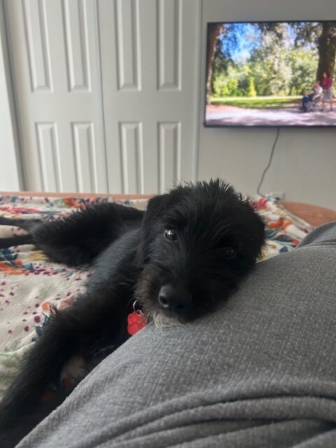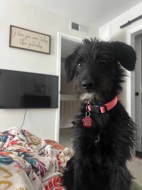 Amy is a border collie + poodle mix. With the brains of a border collie and the charm of poodle, this sweet girl is as lovable as they come.