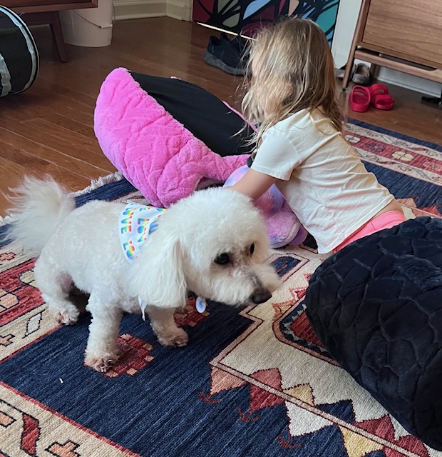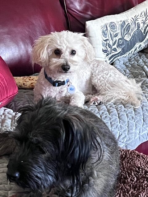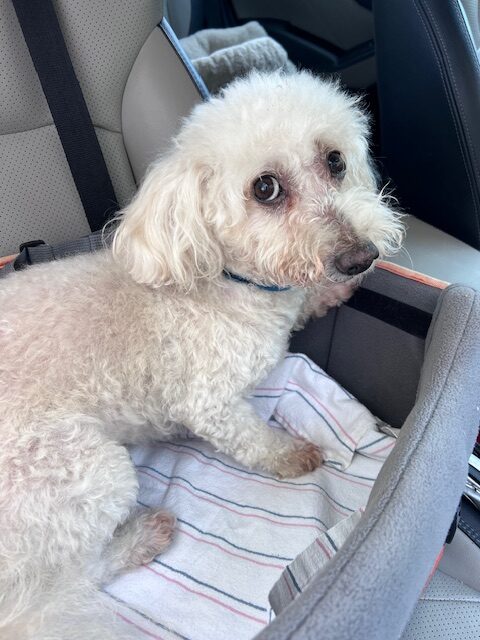 Fergus is an approximately seven-year-old male Poodle-Bichon mix. He is wonderful with other dogs, cats, and children. He is playful, loves going on walks, is an excellent car traveler, and is very affectionate. He enjoys cuddling on the couch, playing with his squishy toys, having his ears combed, and sleeping in bed with his human.