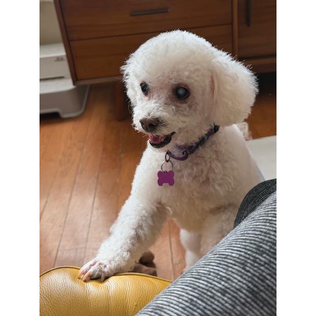 This vibrant 10-year-old miniature poodle/cavapoo mix is full of life. With her soft, curly white fur, she’ll steal your heart in no time. Colette loves cozying up on your lap while watching TV and is always ready to jump outside to chase birds. She's an adventurous spirit, enjoying car rides and curiously observing the world. She is approx. 9Lbs. Colette is incredibly easy to care for; she’s housebroken and kennel trained, making her trustworthy while you’re out. Her head tilts as if she understands everything you say, and she truly is a joy to have around. Despite a cataract in one eye, her vision is great, day or night. Colette's adoption fee is $350.00, covering her core vaccines, rabies shot, microchip, and spay. If you're seeking a loving companion, fill out an adoption application to welcome Colette into your family. She’s excited to start this new chapter with you!