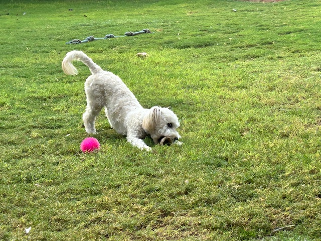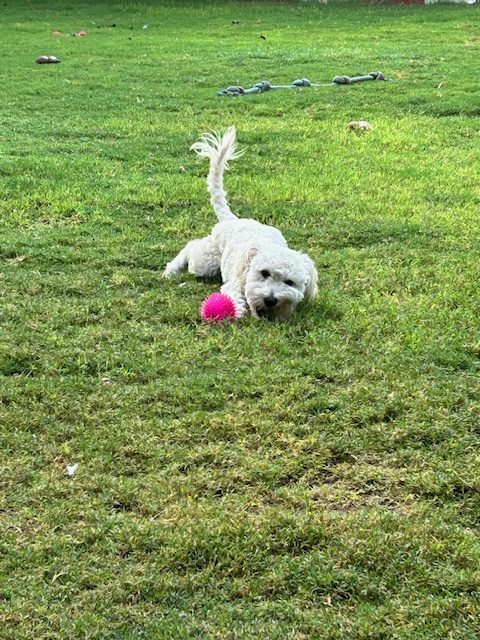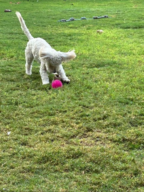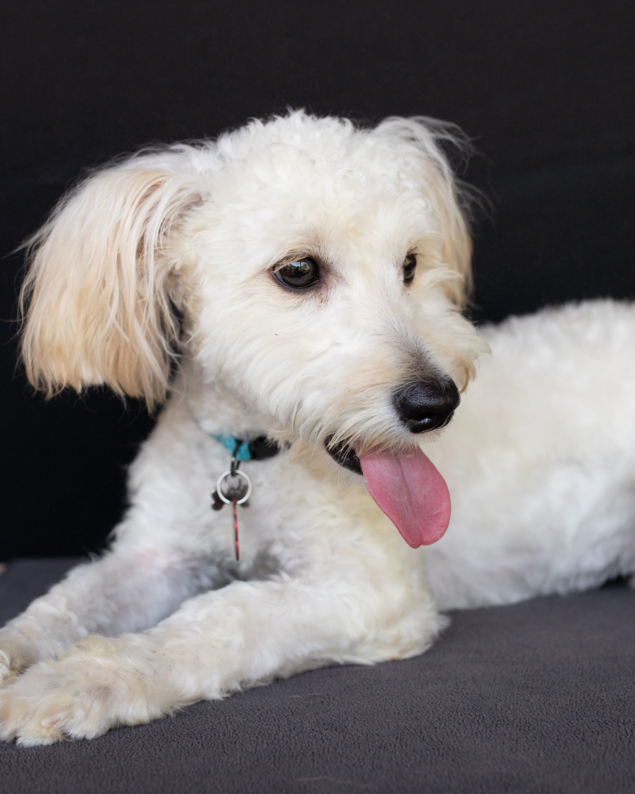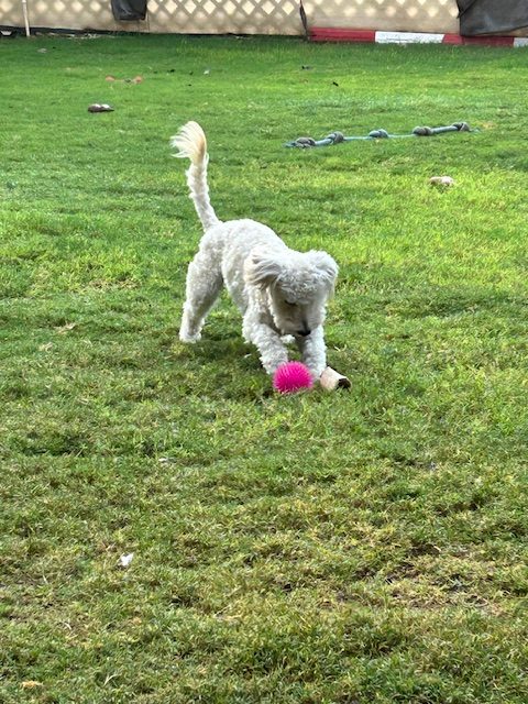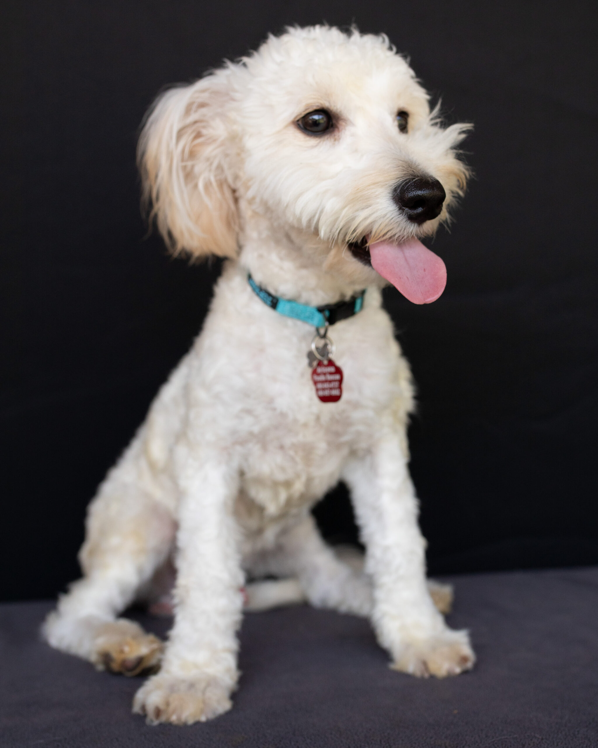 Milo is a 8-month old adorable poodle mix. He is a very playful and affectionate pup who likes to sit on laps. Milo gets along with other dogs and cats and loves to play with toys. He is neutered, chipped, fully vaccinated, housebroken and uses a doggie door.