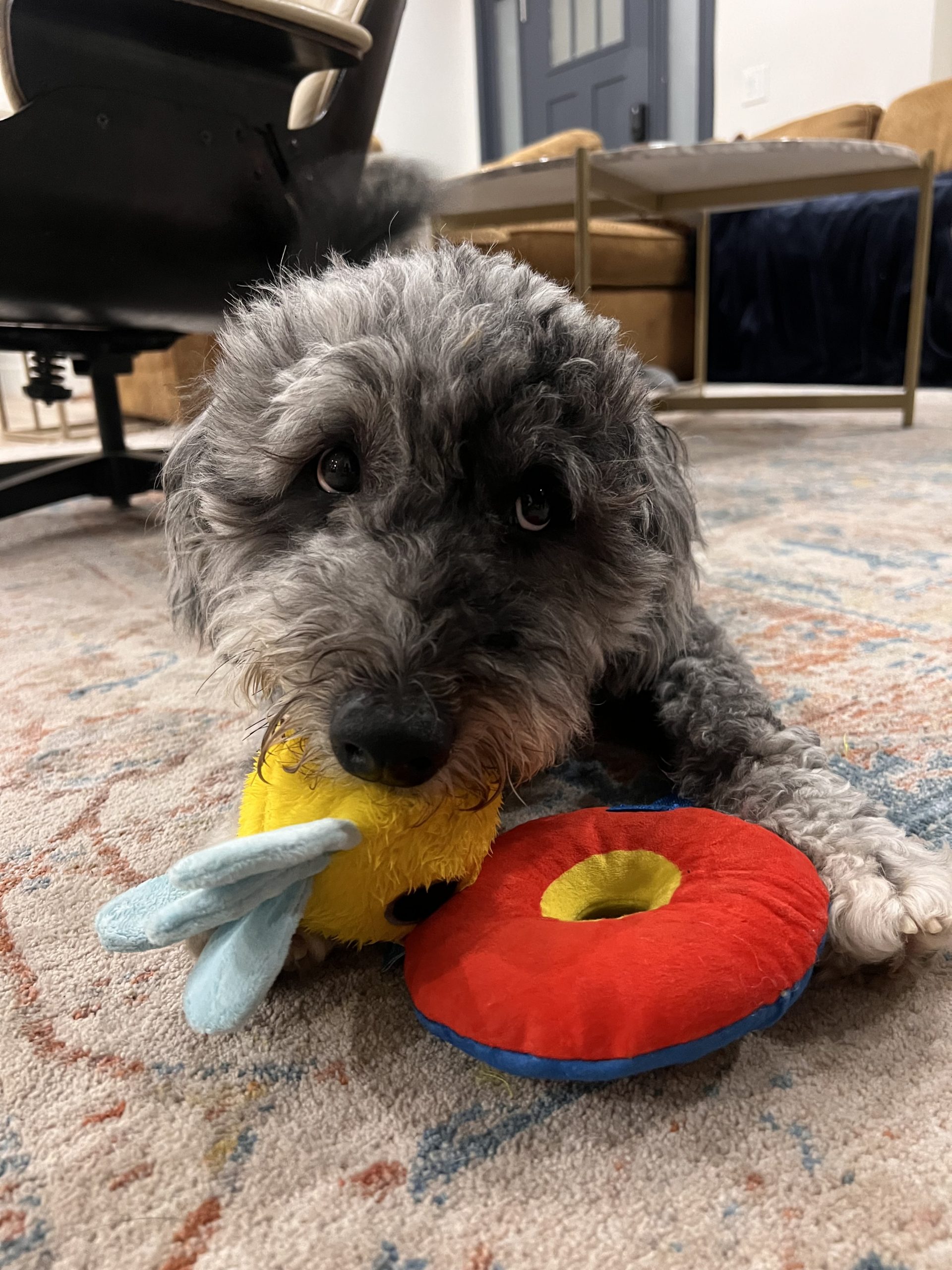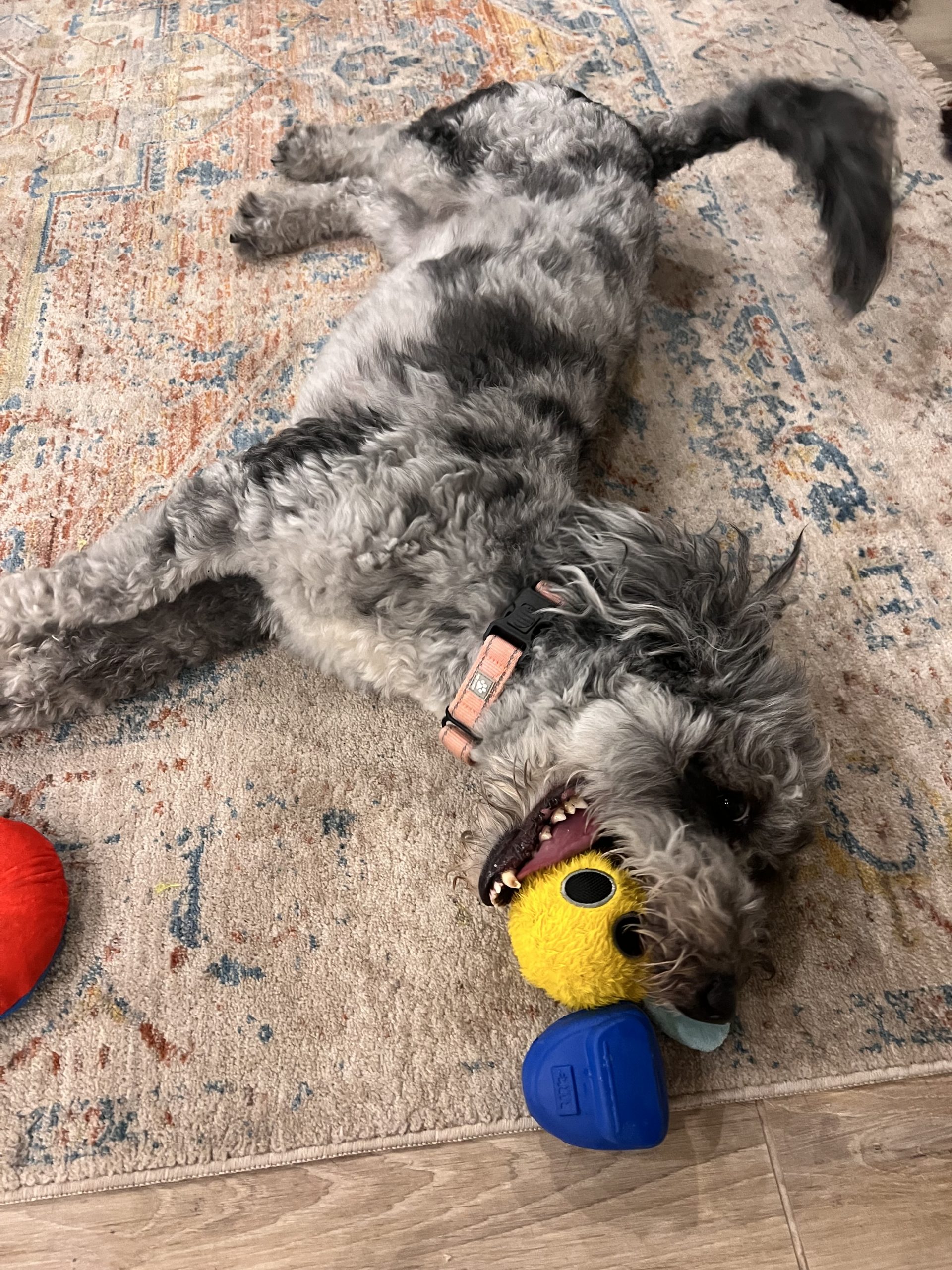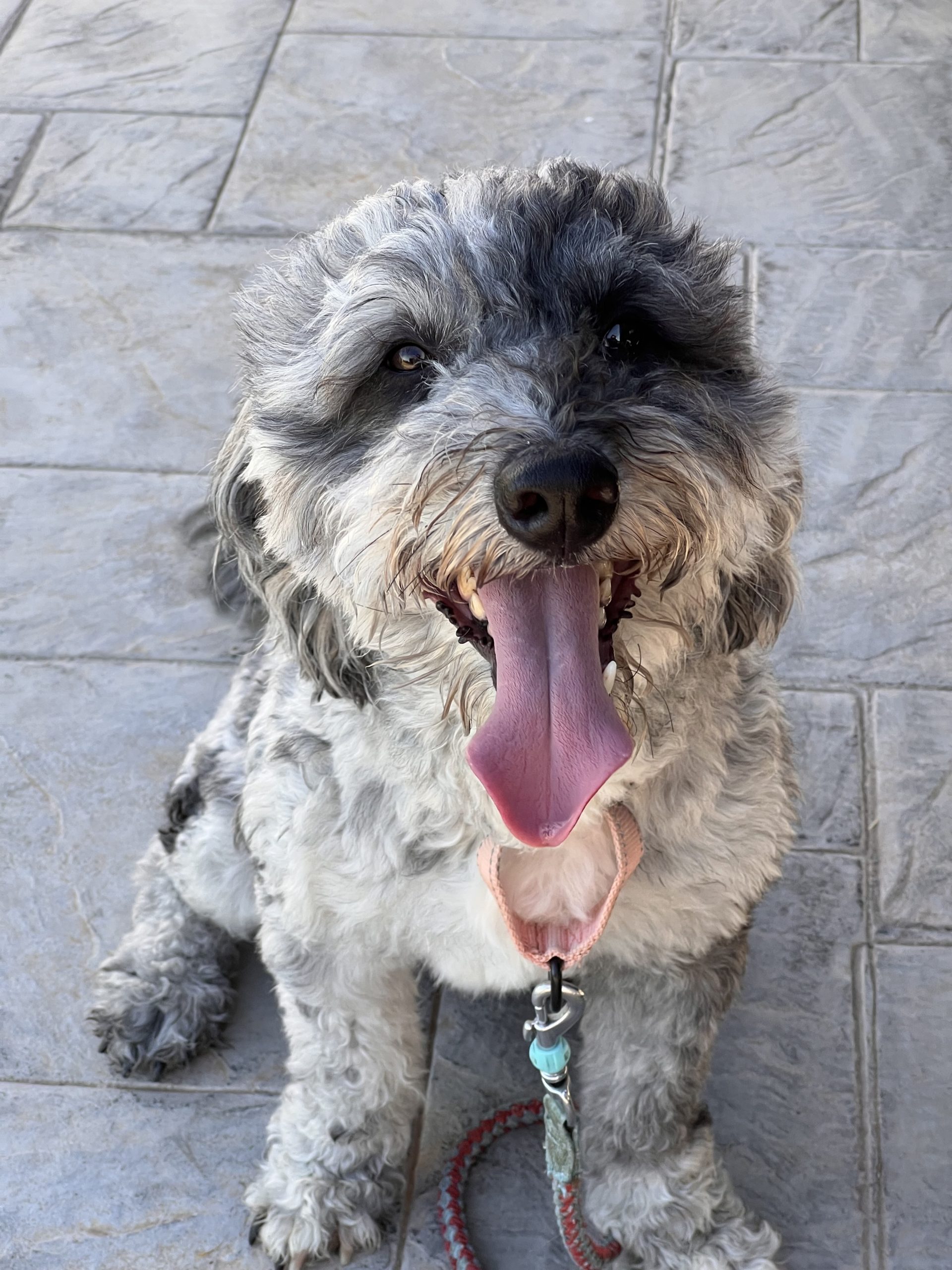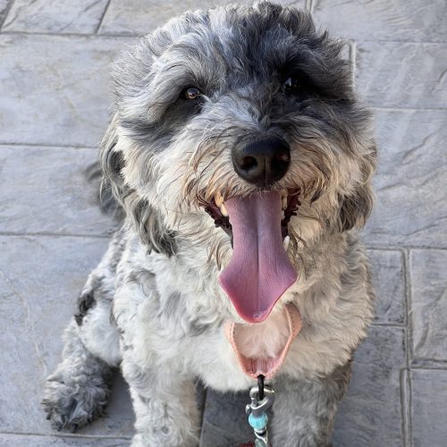 RJ aka Roscoe is a 3-year-old tri-color Merle Sheepadoodle mix with the biggest smile and most soulful eyes you’ll ever see. He is sweet natured, crate trained and potty trained.