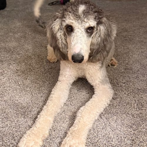 Dancer is a two year old standard female who sweet and playful, and full of love and curiosity! She adores toys of all kinds and is always excited to explore the world around her. With her curious nature, she may want to “inspect” your shoes, so keeping them tucked away is a good idea! She’s dog-door trained and loves playing with other dogs. Most of all, she’s a total cuddle bug who would happily snuggle up with you anytime she gets the chance.