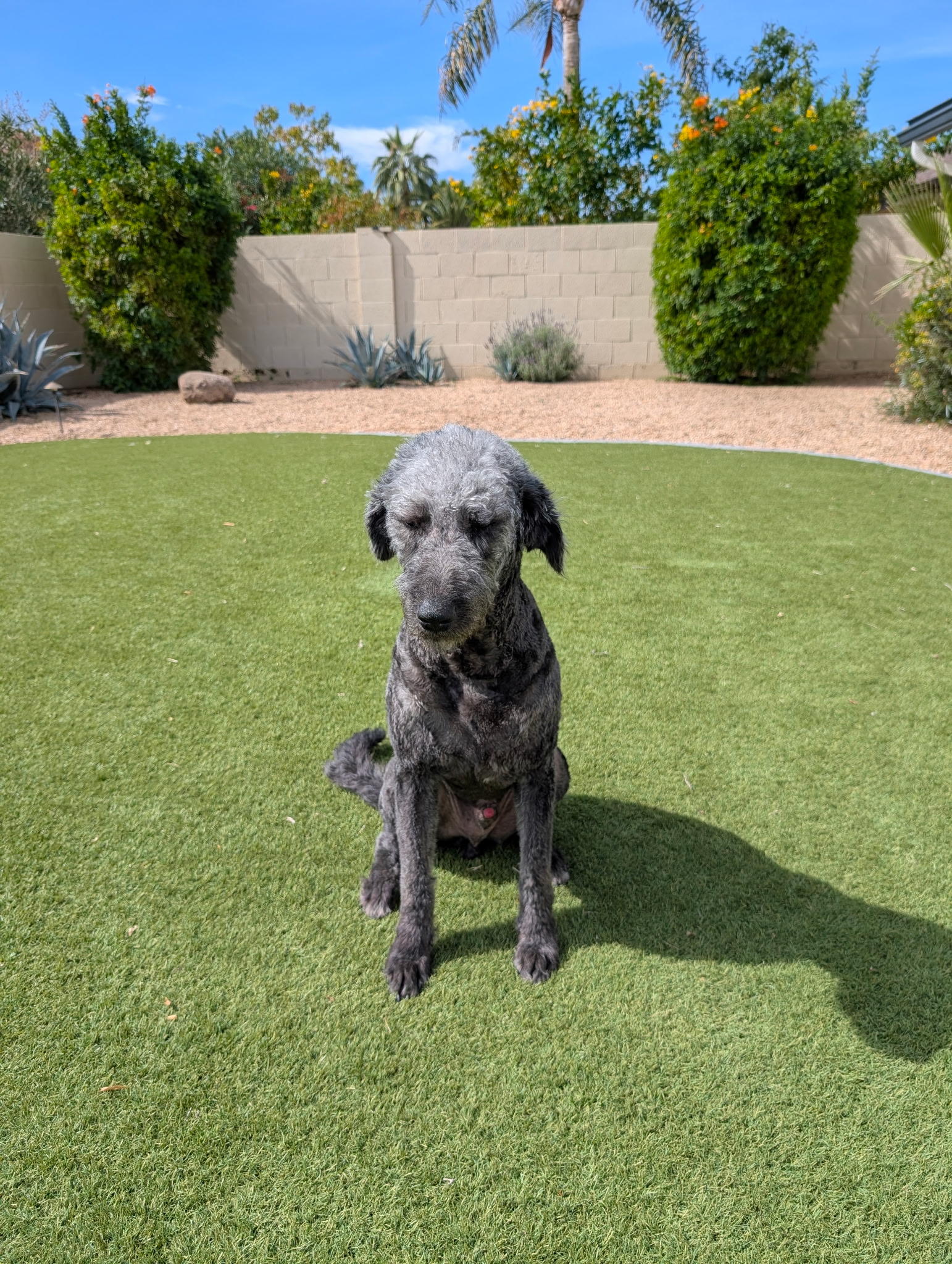 He appears to be housebroken, though he may have an occasional nervous or excited pee while he’s adjusting. He sleeps well in his crate when needed, even if he doesn’t choose to go in on his own yet. With a little consistency and encouragement, he’s already on the path to great progress.