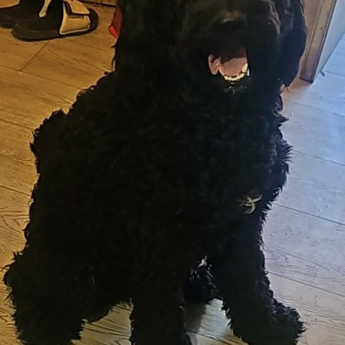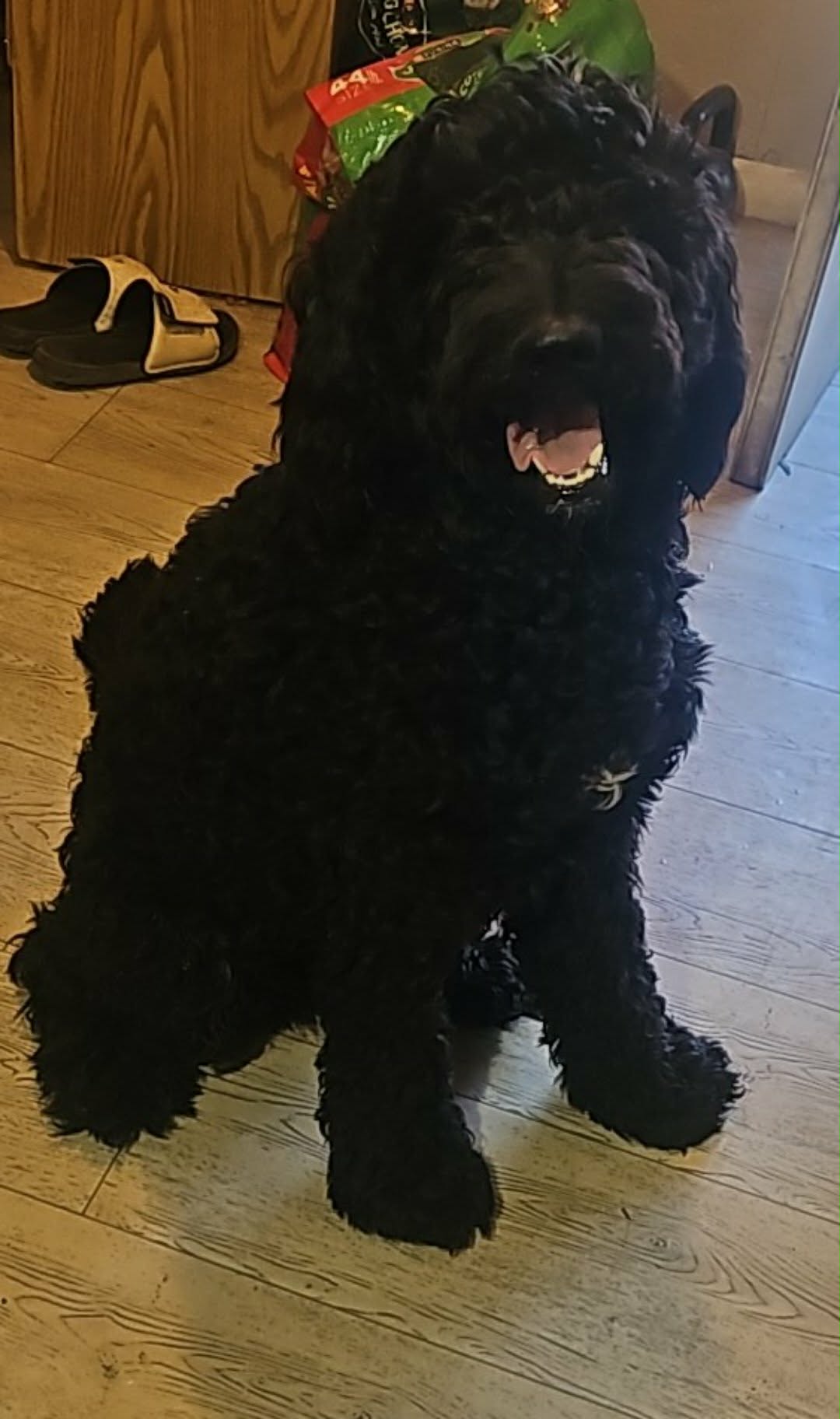 Milo is a cheerful, one-year-old black GoldenDoodle with a charming splash of white fur on his chest. This happy-go-lucky pup loves to play in the yard, engaging joyfully with toys and everyone he meets. Friendly with dogs, he hasn't interacted with cats yet. Though he looks like a full-grown dog, Milo is still a puppy at heart, learning his manners along the way.